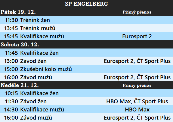 Poslední zastávkou Světového poháru před začátkem tradičního Turné čtyř můstku obstará neméně tradiční středisko ve švýcarském Engelbergu, které v kalendáři elitní úrovně nechybí od sezony 1990/91. Stejně jako v předchozích dvou ročnících se na Gross-Titlis-Schanze představí nejen skokani, ale také skokanky – v čele s Domenem Prevcem mezi muži a Nozomi Marujamou v ženské kategorii. Český tým vysílá do boje kvarteto Koudelka, Indráčková, Ulrichová a debutant David Rygl.