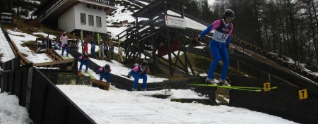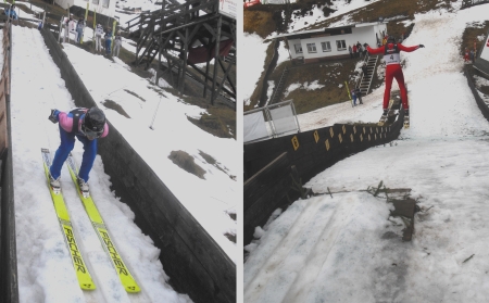Po chutném guláši se všichni převléknou do skokanského a vydají se na můstek. Tedy přesně řečeno ne úplně nahoru na můstek, ale k jeho odrazové hraně. Pro začátek stačí pouhé sjíždění bubnu místní K15. Když se vám po pár pokusech vytratí z nohou nejistota a zdá se, že si lyžím jakž takž přivykáte, zakřičí trenér „Schanze“, což je pokyn k tomu, vzít lyže na ramena a vydat se až nahoru na můstek. Nyní začíná to opravdové skákání. Jeden pokus následuje druhý, mezi tím trenér vše hodnotí a upozorňuje na nedostatky. Když už máte v nohách 10 – 15 skoků a tím pádem i stejný počet výšlapů na nájezd, začíná se smrákat a to je ta chvíle, kdy je potřeba přestat a přichystat se na neděli.