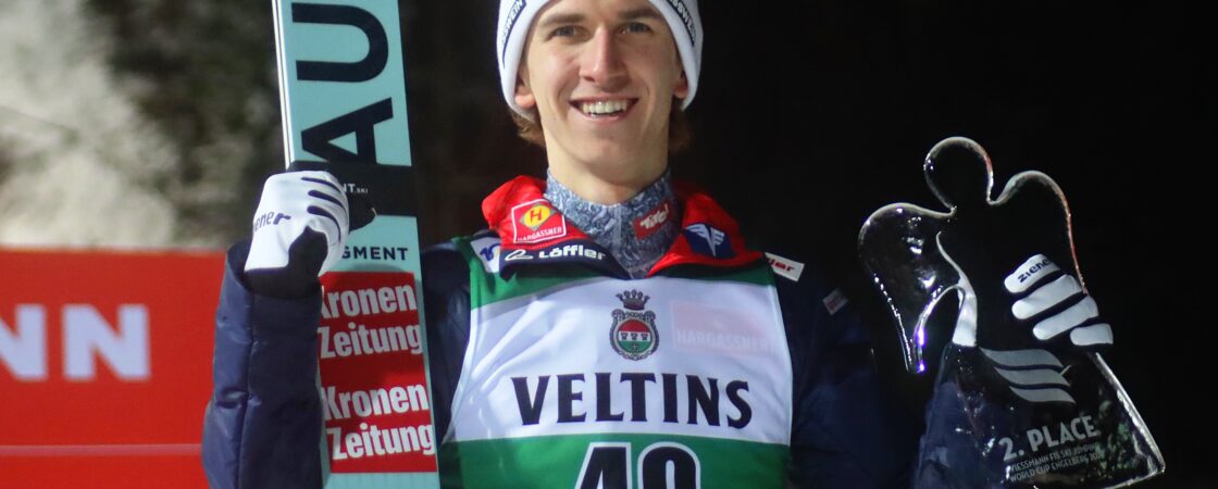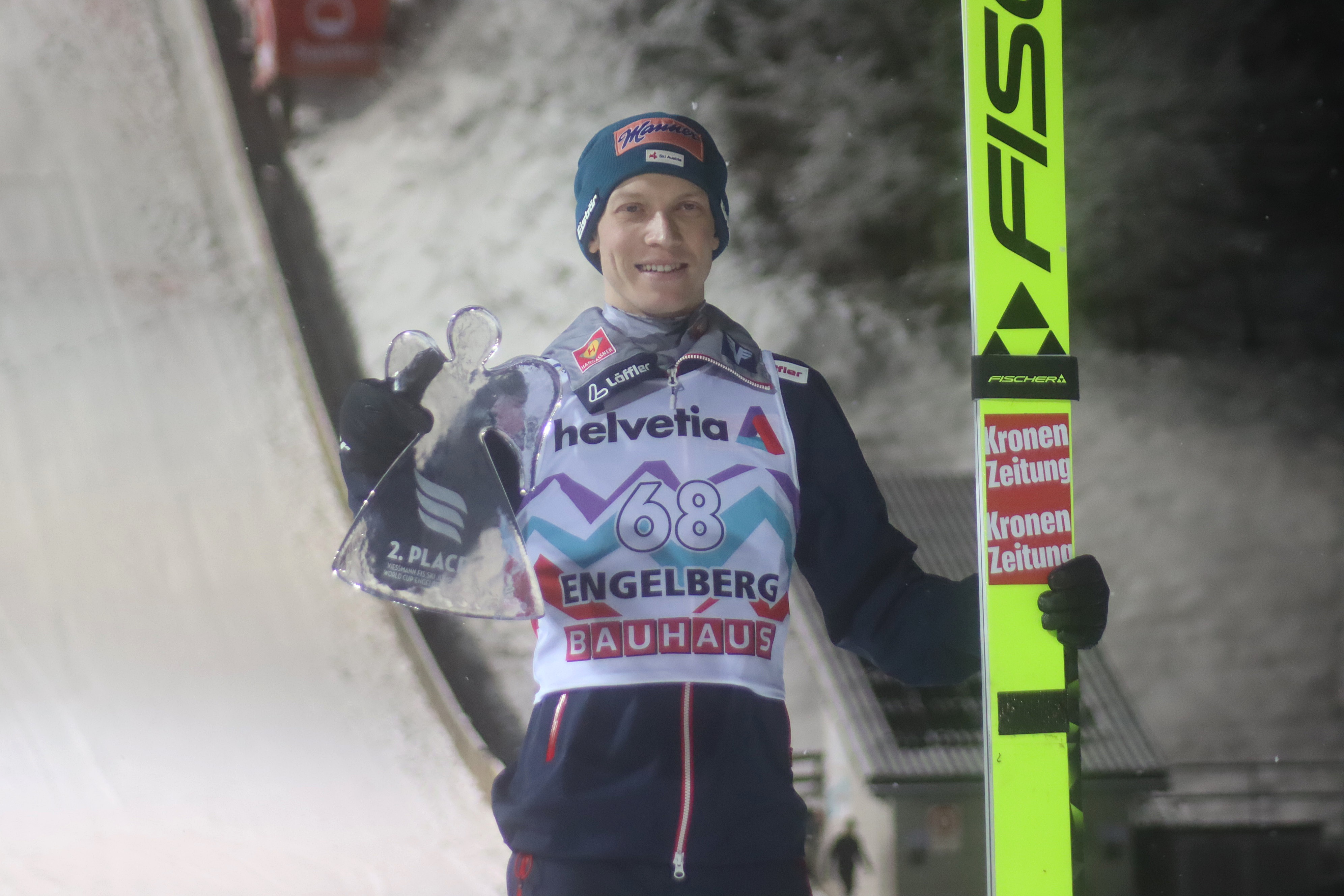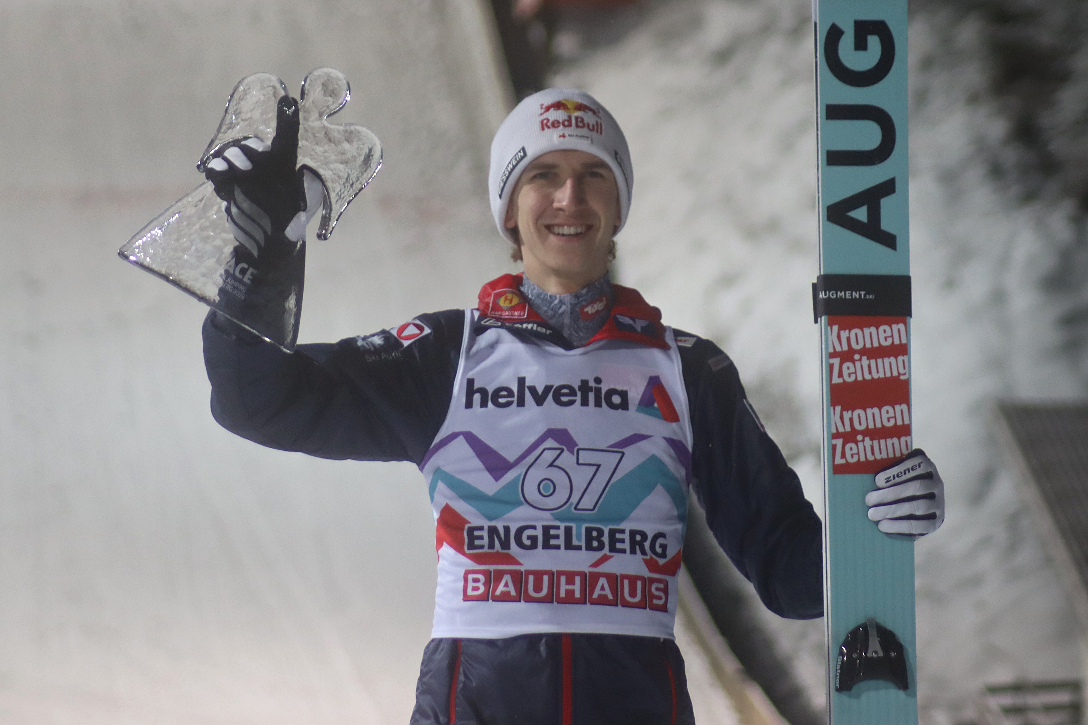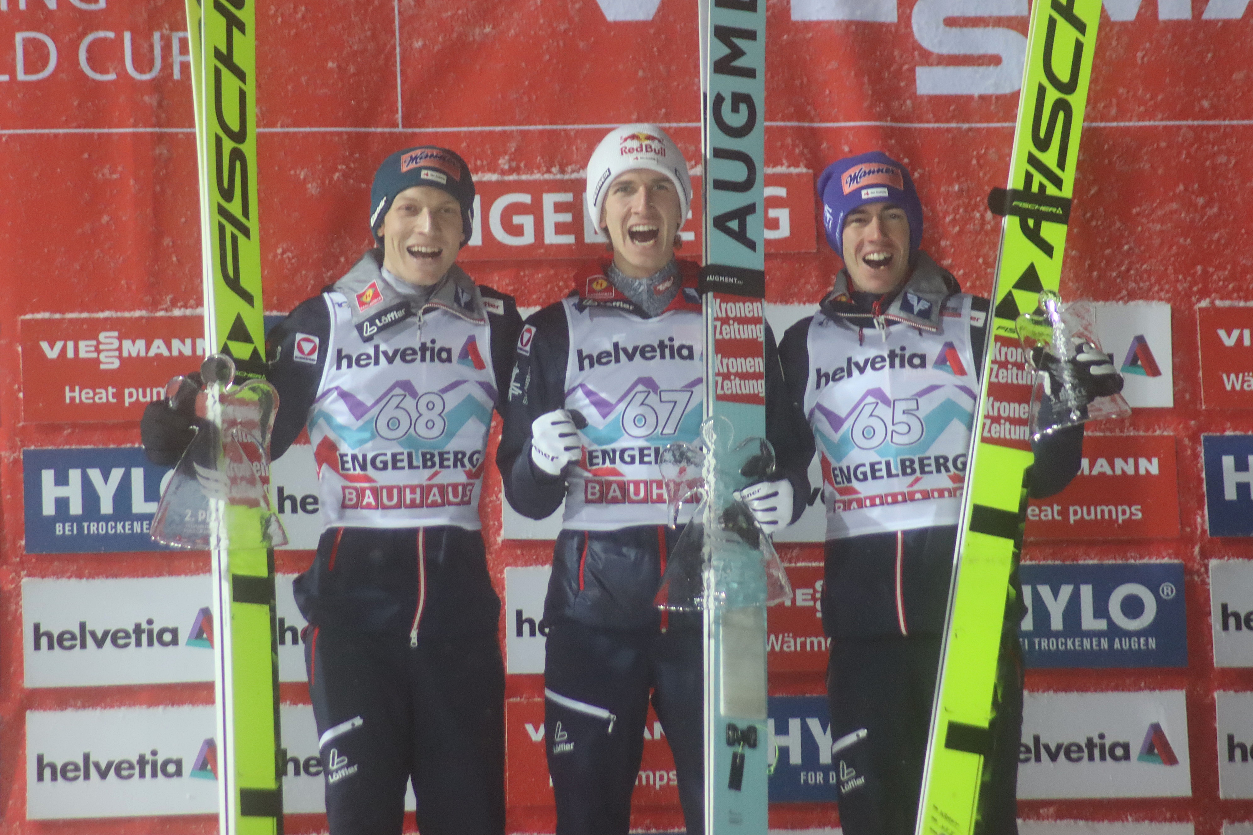 Zatímco po zrušení závodu žen to s tím mužským i vzhledem k sílícímu sněžení vypadalo všelijak, nakonec se odjel bez sebemenších problémů. Start se sice opozdil o půl hodiny kvůli protahující se přípravě můstku, celá soutěž však zabrala pouhopouhých 75 minut, což je čas, který bude atakovat rekordy. Díky vydatnému přírodnímu zasněžování se navíc s výjimkou první poloviny úvodního kola nekonala typická engelbergská „kosa“ zadního větru a světová špička skákala ve velmi férových podmínkách. Odplatu za včerejší druhé místo dokonal Daniel Tschofenig (135 a 137,5 m), který vrátil včerejší porážku Janu Hörlovi (130 a 138,5 m). Tschofenig vévodil již po prvním kole a stejně jako ve Wisłe své vedení nepustil. Stupně vítězů doplnil  po slabších předešlých závodech Stefan Kraft (2 x 135 m), jenž pozávodní ceremonii zažil již po 122. Potřicáté v historii tedy stupně vítězů v závodě Světového poháru obsadili zástupci z jedné země. Naposledy se to povedlo identickému rakouskému triu v březnu v Trondheimu.