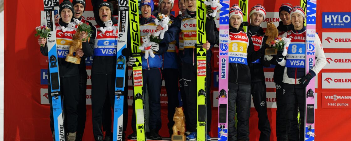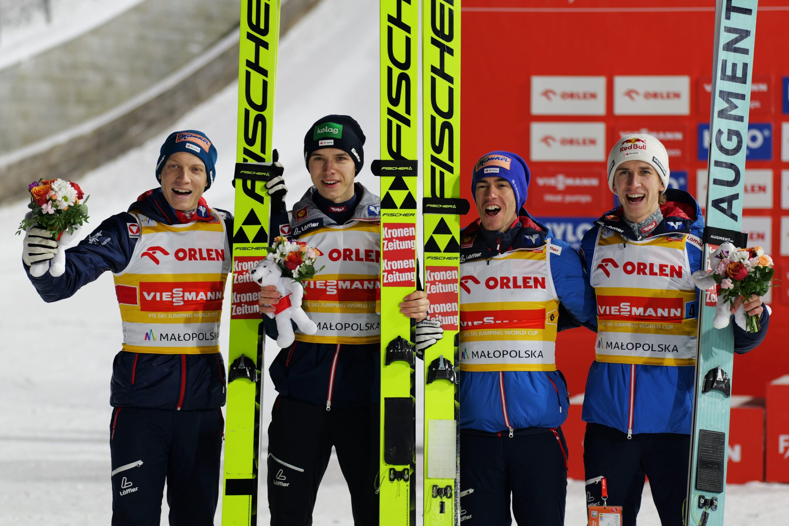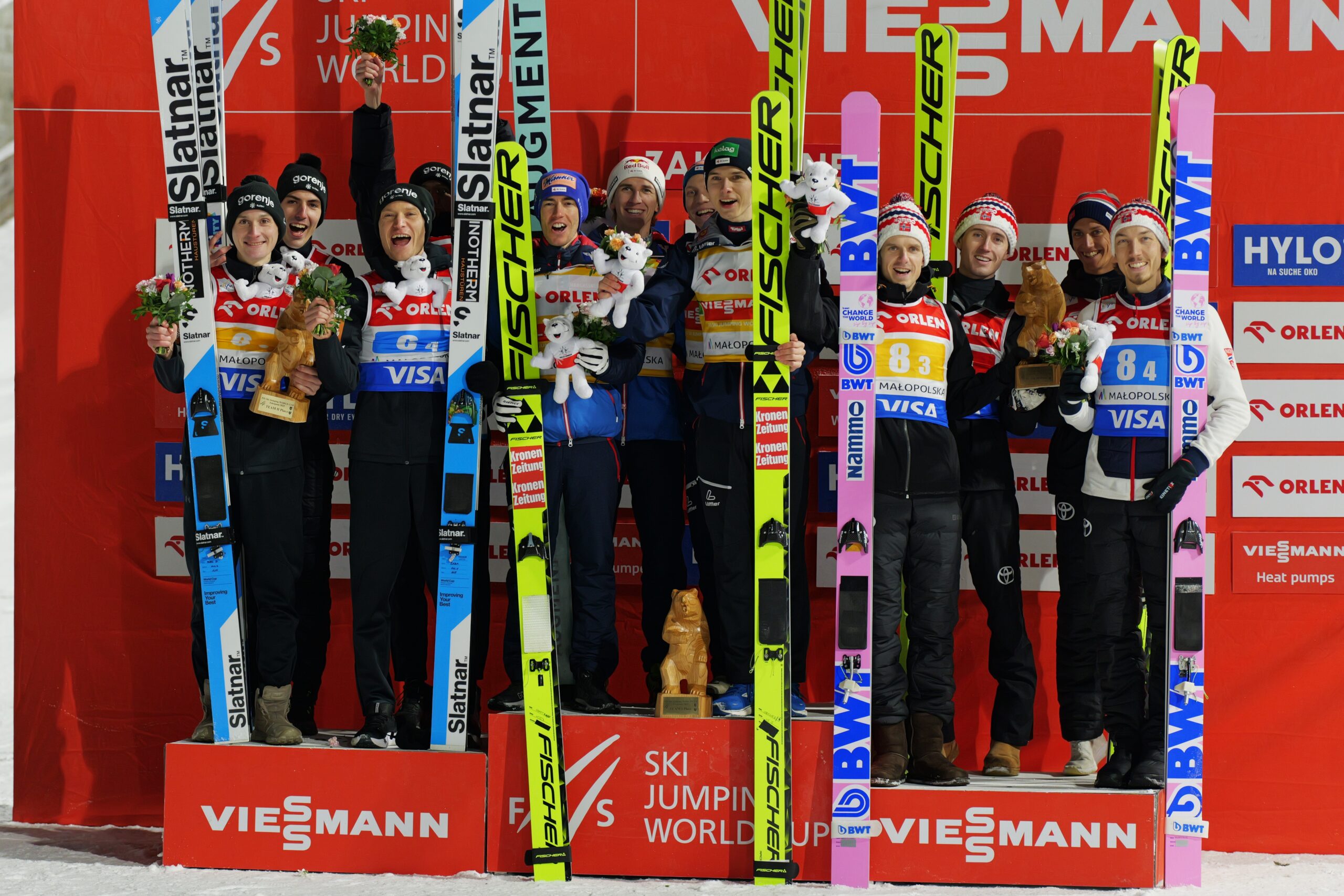 Asi málokdo očekával, že by suverénní Rakušané mohli najít v týmovém klání přemožitele. A čtveřice ve složení Jan Hörl, Maximilian Ortner, Stefan Kraft a Daniel Tschofenig svou roli jednoznačných favoritů bez váhání potvrdila. Větší zápletku nabídl až souboj o druhé místo, v němž uspěli Slovinci, kteří se posledním skokem dostali před třetí Nory.