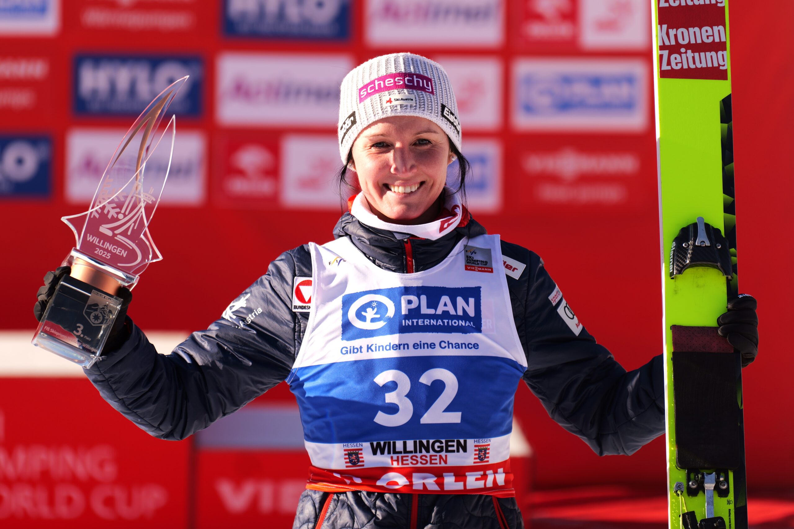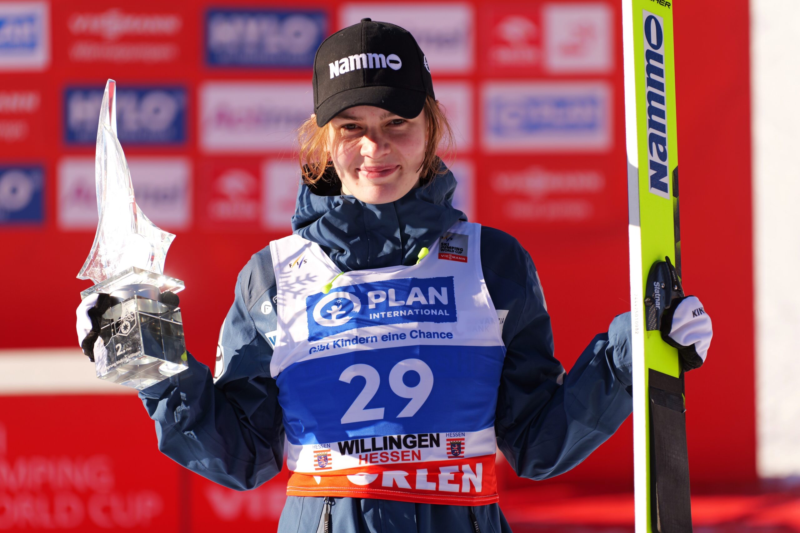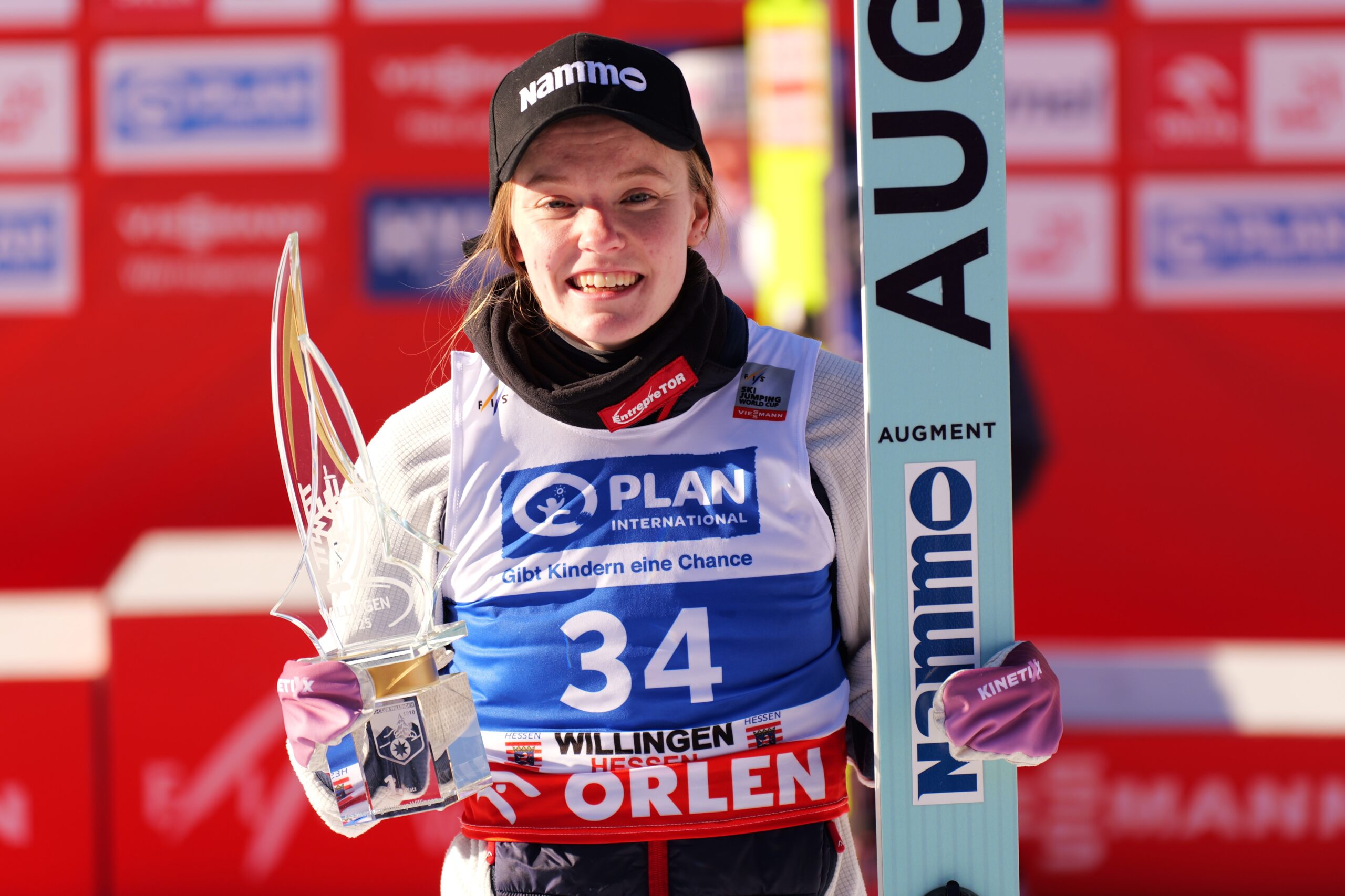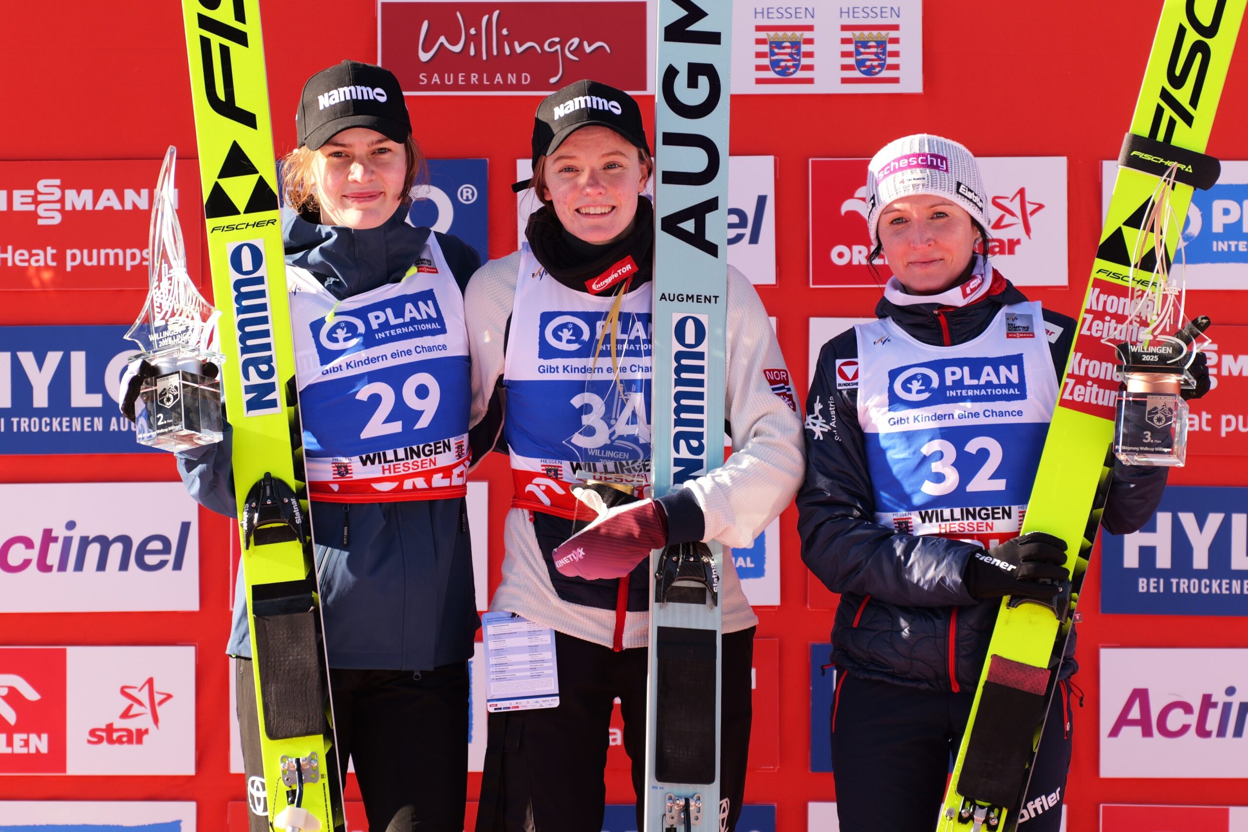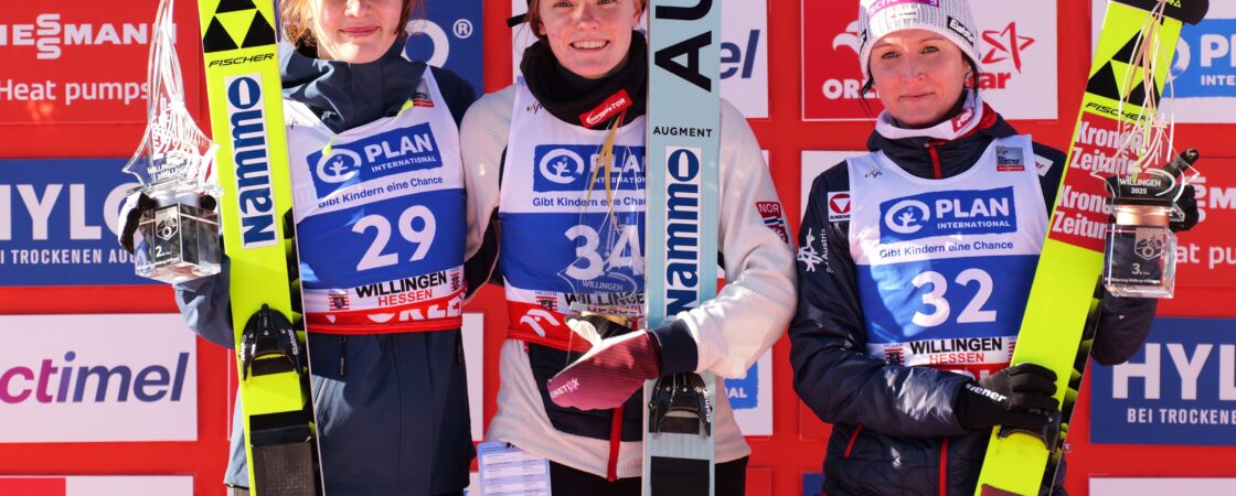Momentálně třetí žena Světového poháru, Eirin Maria Kvandal, pokračuje ve výborné formě. V jejích posledních šesti startech v závodech SP se hned pětkrát umístila na stupních vítězů, a k jednomu suverénnímu vítězství v Sapporu dnes ve Willingenu přidala další. Její skoky do vzdáleností (137 a 144,5 m) jí přinesly první místo s velkým náskokem 15,9 bodů na druhou Annu Odine Strøm, která vyhrála první kolo (139 a 137 m). Třetí místo se ztrátou 25,1 bodu na vítězku obsadila Jacqueline Seifriedsberger (137,5 a 147 m). Její skok v druhém kole byl vůbec nejdelším pokusem celého závodu a jen horší stylové známky za doskok do podřepu jí stály ještě lepší umístění.