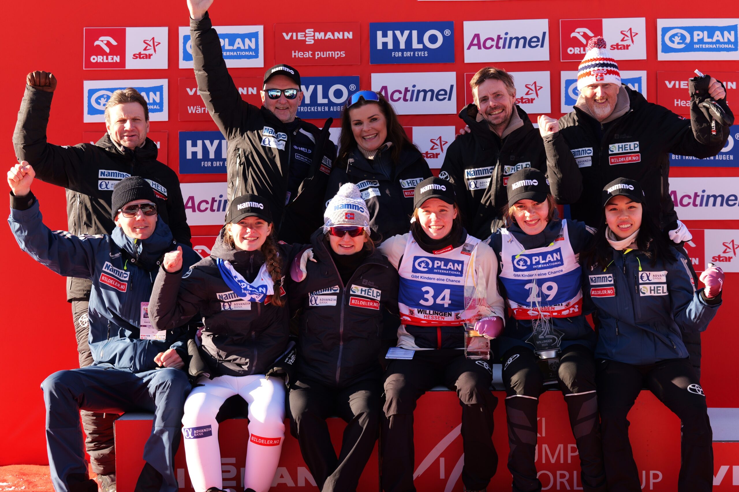 Ve výborné formě pokračuje také Norka Thea Minjan Bjørseth (129,5 a 136,5 m), která obsadila čtvrté místo a její série umístění v nejlepší desítce se natáhla už na sedm závodů. Dnes nejlepších z domácích skokanek, Agnes Reisch, po dlouhém skoku v prvním kole (142 m, 4. místo) mohla pomýšlet na boj o stupně vítězů. Skok na značku 135,5 metru v druhém kole jí však nakonec stačil na páté místo. Šesté místo obsadila vedoucí žena SP, Slovinka Nika Prevc (121 a 135 m), která se stala obětí necitlivého snížení nájezdového okna v prvním kole. Sedmé místo obsadila nejlepší z Japonek Sara Takanaši (125,5 a 137,5 m), osmé další z domácích reprezentantek Selina Freitag (128,5 a 138 m), deváté místo a návrat do nejlepší desítky po pauze v SP (naposledy startovala ve Villachu na začátku ledna), vybojovala Norka Ingvild Synnøve Midtskogen (130 a 129 m). Norské reprezentaci se ve Willingenu prozatím nesmírně daří – po vítězství ve včerejším závodu smíšených týmů se hned 4 jejich skokanky umístily v nejlepší desítce dnešního závodu.