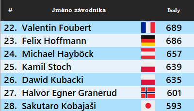 Kamil Stoch v Japonsku nestartuje, Poláci si tedy polepšit nemohou. Zezadu však číhá Nor Granerud, jemuž na poslední alokační místo pro 4. norského závodníka schází hratelných 38 bodů (stačilo by mu skončit dvakrát mezi elitní třináctkou, případně jednou mezi top šestkou). Sakutaro Kobajaši ztrácí 46 bodů, při jeho formě by se však stažení tohoto manka rovnalo spíše zázraku. Pokud Granerud ani Kobajaši neuspějí, současná situace se v ničem nezmění a Češi musí doufat v alespoň jeden bod Davida Rygla. Pokud však Granerud úkol zvládne, z kvalifikované padesátky vypadne po zisku dalšího norského místa Číňan Song a David Rygl bude za aktuální situace potřebovat minimálně tři body. Poté by přeskočil Turka Bedira a z hlavního žebříčku by vypadl Rumun Spulber. Z tohoto pohledu by tedy nepomohlo, ani kdyby Rygl v Číně býval startoval a oba závody vyhrál, jedinou jistotou jsou totiž body z elitního seriálu.