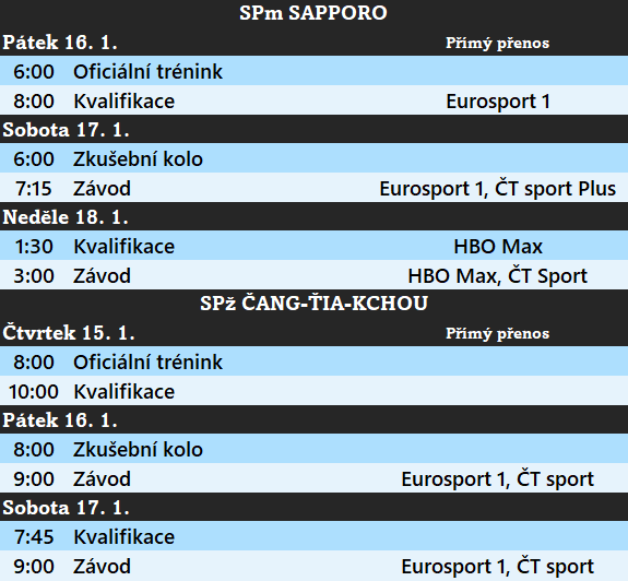 Poslední víkend s možností kvalifikovat se na olympijské hry čeká po ženách také muže. Ti se utkají v japonském Sapporu, v pátek skokany čeká první z kvalifikací a o víkendu dva individuální závody. Českou republiku bodu reprezentovat Roman Koudelka a David Rygl, jenž v případě prvních kariérních bodů ještě může Česku zajistit olympijskou místenku. Chybět nebude ani Slovák Hektor Kapustík.