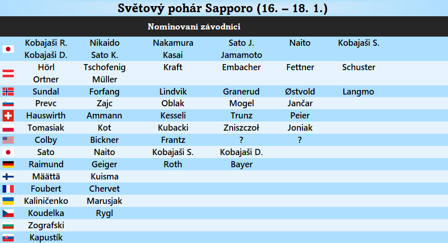 Tradiční často jedinou asijskou zastávkou Světového poháru je můstek Ókurajama v Sapporu, jehož konstrukční bod je na hodnotě 123 metrů a jehož velikost je 137 metrů. Minulý rok zde dvakrát zvítězil domácí Rjójú Kobajaši, poprvé před Janem Hörlem a Domenem Prevcem, podruhé ho na stupních vítězů doplnili Norové Marius Lindvik a Johann André Forfang. Ti před domácím šampionátem nabírali formu, která se však ukázala být dána také jejich kombinézami, za které byli záhy diskvalifikováni a suspendováni na 6 měsíců. Pryč jsou doby, kdy japonská zastávka byla místem odpočinku v náročné sezoně a týmy posílaly v převážné většině své B, neřkuli C týmy. Na rozdíl od víkendu v Zakopanem se dá čekat takřka plná soupiska, kdy z větších jmen bude chybět kvůli drobnému zranění kolene Felix Hoffmann a kvůli potřebě tréninku či odpočinku Anže Lanišek a Gregor Deschwanden. Vrací se rakouské a japonské hvězdy či Philipp Raimund, již kvalifikace by tedy mohla nabídnout zajímavou podívanou. V ní se bude pokoušet ve věku 53 let o svůj 580. individuální start mezi elitou legendární Noriaki Kasai, zajímavostí je také premiéra bývalého kvalitního sdruženáře Go Jamamota.