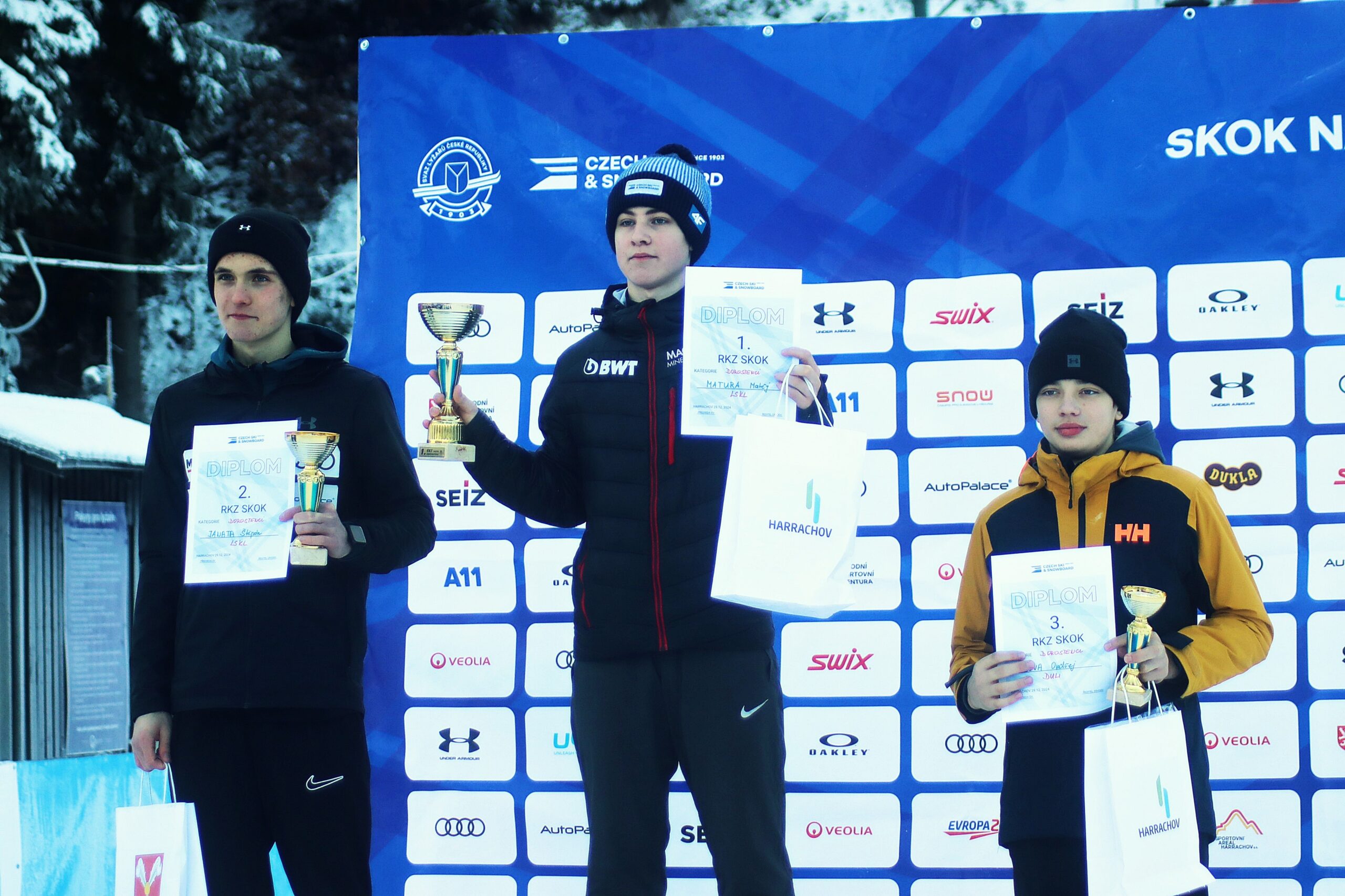 V dorostenecké soutěži na prostředním z harrachovských můstků se představila šestnáctka závodníků. Pozici favorita potvrdil Matěj Matura (69 a 70 m), jenž s přehledem porazil po loňském zranění nabírajícího formu Štěpána Janatu (66 a 69 m). Loňskou třetí pozici zopakoval Ondřej Sova (67 a 68,5 m), tentokrát však s mnohem nižším odstupem na špičku.