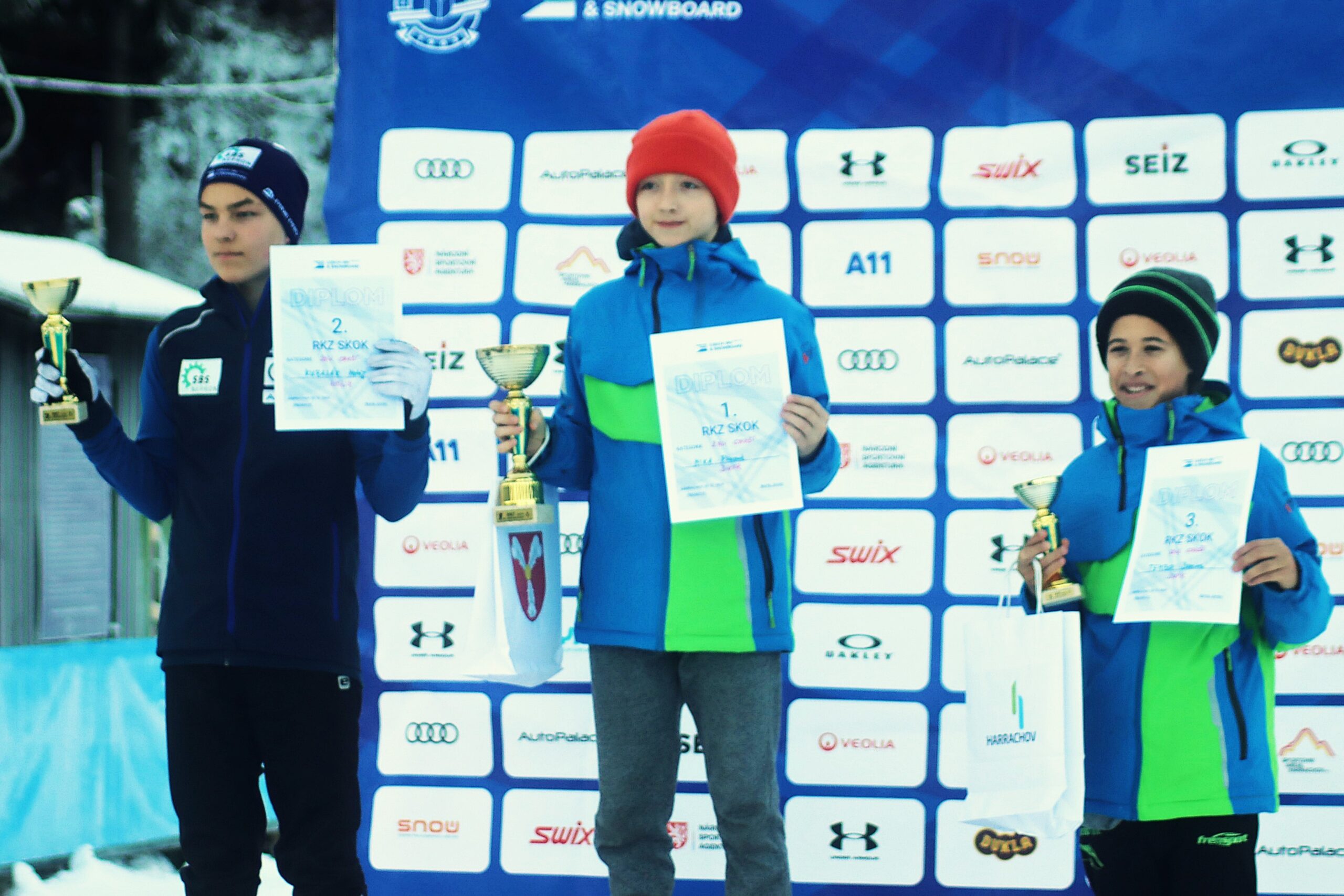 Mezi chlapci se mezi třináctkou účastníků blýsknul Přemek Mika (38 a 38,5 m) z Frenštátu pod Radhoštěm. O takřka devět bodů za ním zaostal reprezentant Nového Města na Moravě Matěj Kubalák (36 a 37,5 m), třetí byl s podobně velkým odstupem další frenštátský závodník Damian Tembo (36 a 36,5 m), jehož srazily nižší body za styl.
