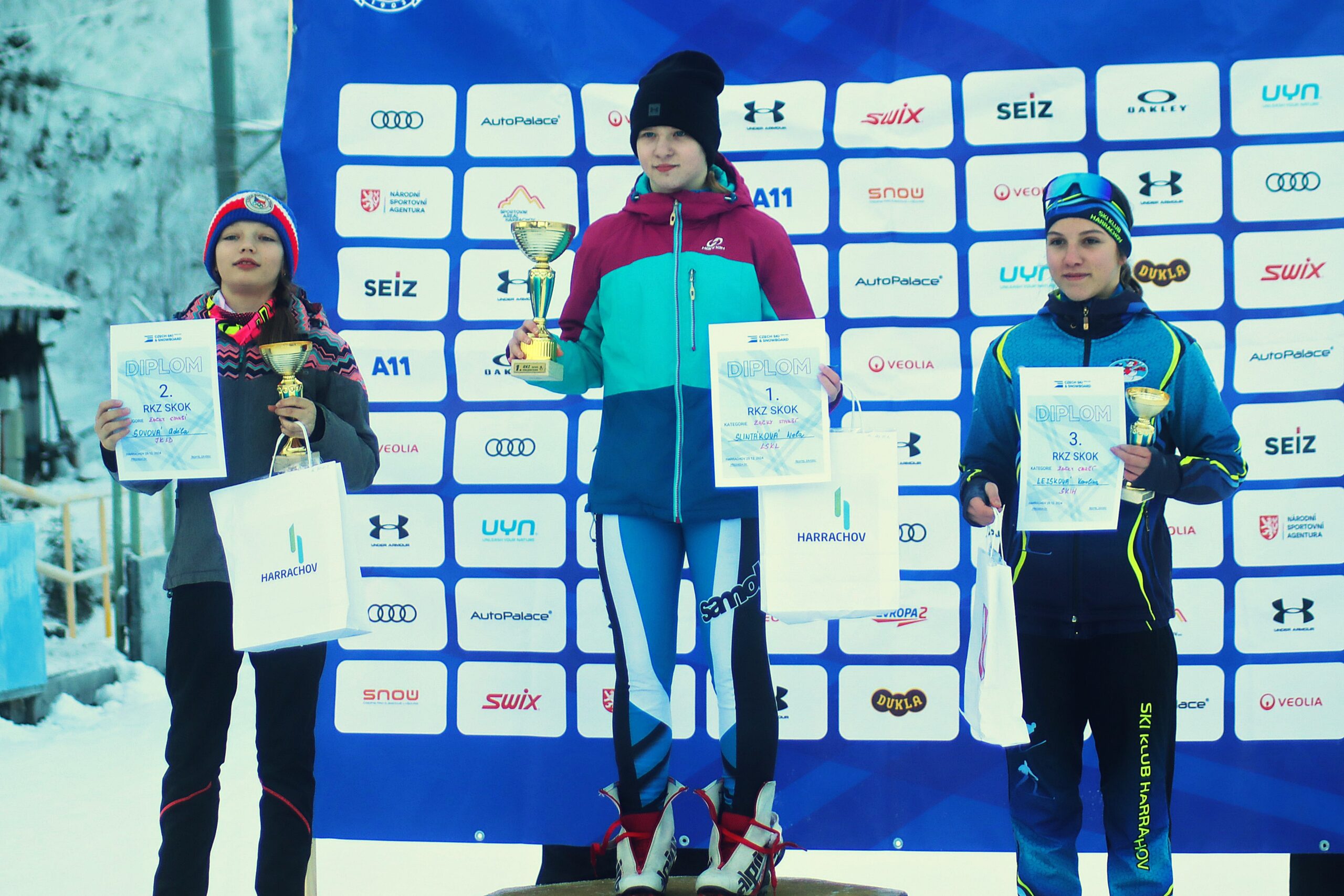 Nejpočetnější dívčí kategorii s devíti startujícími skokankami stejně jako loni ovládla lomnická Nella Slintáková (34 a 33,5 m) s převahou tří bodů nad desenskou Adélou Sovovou (34 a 33,5 m). Třetí příčku si vyskákala domácí Karolína Lejsková (32,5 a 33 m).