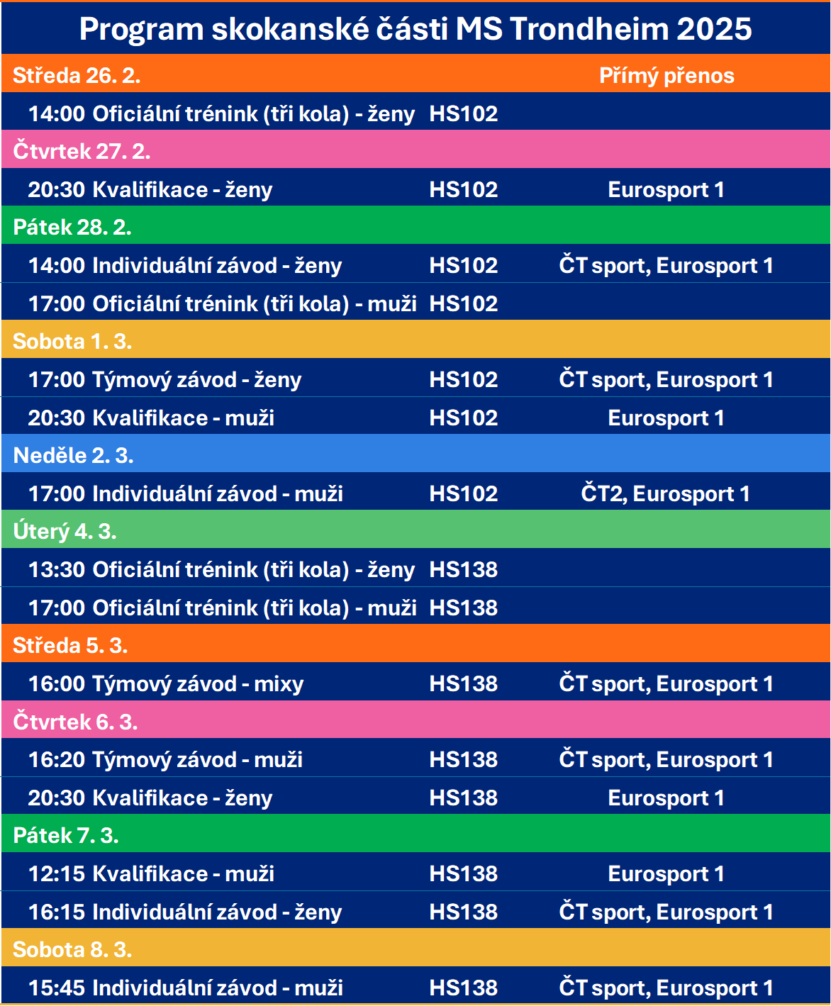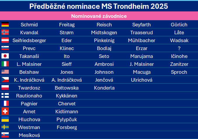 Budeme samozřejmě držet palce i českým reprezentantkám. Ve Světovém poháru letos bodovaly dvě – sestry Anežka a Karolína Indráčkovy. Po výborných pokusech se k nim mohla v neděli přidat i Veronika Jenčová, avšak kvůli příliš velké kombinéze byla diskvalifikována už v prvním kole. I proto bude cílem českých závodnic postup do druhého kola v individuálních závodech a s trochou štěstí třeba i útok na dvacáté místo. V soutěži družstev, do níž se zapojí i Klára Ulrichová, by pak Češky měly cílit na nejlepší osmičku.